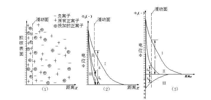 根据DLVO理论,加入含有高价态正电荷离子的电解质时,高价态正离子通过静电引力进入到胶体颗粒表面,置换出原来的低价正离子,这样双电层仍然保持电中性,但正离子的数量却减少了,也就是双电层的厚度变薄,胶体颗粒滑动面上的ξ电位降低。