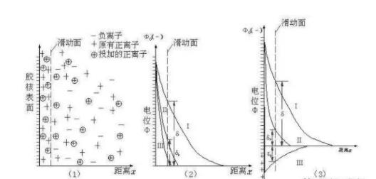 根据DLVO理论,加入含有高价态正电荷离子的电解质时,高价态正离子通过静电引力进入到胶体颗粒表面,置换出原来的低价正离子,这样双电层仍然保持电中性,但正离子的数量却减少了,也就是双电层的厚度变薄,胶体颗粒滑动面上的ξ电位降低。